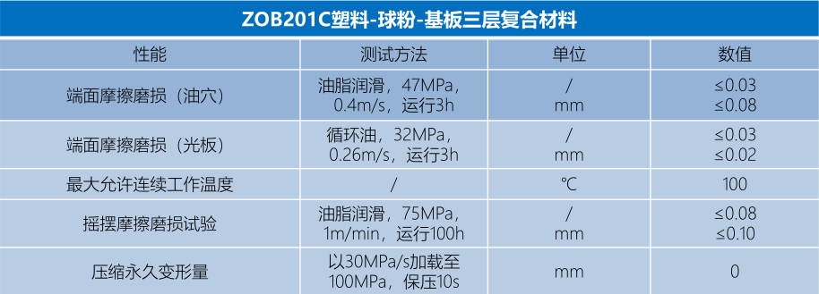 ZOB201C板材是由改性工程塑料層通過熔融、軋制的方式與燒有球形銅粉的低碳鋼基板進行結合而成的。光板常規塑料厚度0.10~0.20mm,油穴根據不同排布而定,一般在0.20-0.40mm。